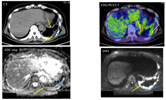 Case 1—Malignant Pleural Mesothelioma (MPM). A 64-year-old male with MPM (cT4N2M0). The yellow arrows indicate the MPM. The blue arrows indicate pleural effusion. Computed tomography (CT) showed left pleural thickness of the MPM. The apparent diffusion coefficient (ADC) of the MPM was 0.84 × 10−3 mm2/s (positive) and the ADC of the pleural fluid was 3.95 × 10−3 mm2/s (negative). Fluorodeoxyglucose (FDG)-position emission tomography (PET)/CT showed partial accumulation (standardized uptake value (SUV)max: 12.39) of FDG on the MPM.
