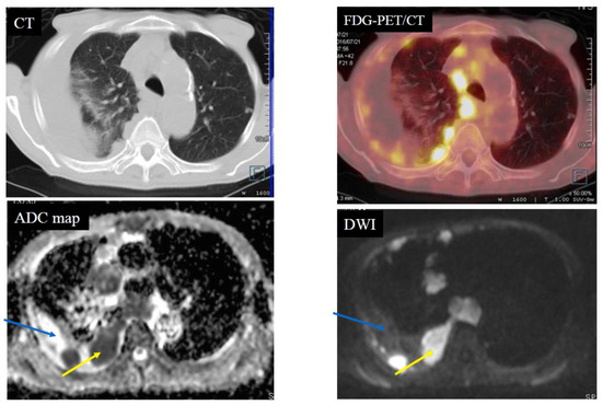 Case 2—Pleural dissemination of lung cancer. An 81-year-old male with pleural dissemination of a large cell neuroendocrine carcinoma. The yellow arrows indicate pleural dissemination. The blue arrows indicate pleural fluid. The apparent diffusion coefficient (ADC) of the pleural dissemination was 0.67 × 10−3 mm2/s (positive) and the ADC of the pleural fluid was 3.03 × 10−3 mm2/s (negative). Fluorodeoxyglucose-position emission tomography/computed tomography (FDG-PET/CT) showed scattered accumulation (standardized uptake value (SUVmax): 14.7) of the FDG on the pleural dissemination.