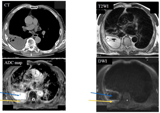 Case 3—Empyema. A 70-year-old male with right empyema. The yellow arrows indicate pleural thickness. The blue arrows indicate pleural fluid. The apparent diffusion coefficient (ADC) of the pleural thickness was 1.82 × 10−3 mm2/s (negative) and the ADC of the pleural fluid was 3.95 × 10−3 mm2/s (negative).