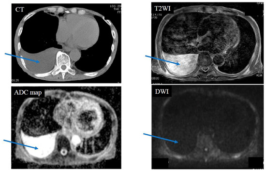 Case 4—Pleural effusion due to exudative pleurisy in a 79-year-old male, who suffered from right pneumonia. The blue arrows indicate pleural fluid. Pleural effusion was not seen in diffusion weighted magnetic resonance imaging (DWI). The apparent diffusion coefficient (ADC) of pleural fluid was 4.02 × 10−3 mm2/s (negative).
