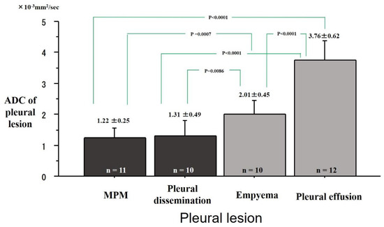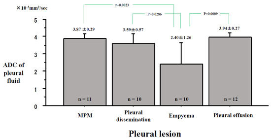 Differences in the apparent diffusion coefficient (ADC) of the pleural effusion inside the pleural lesions. The ADCs of pleural fluid were 3.87 ± 0.29 × 10−3 mm2/s in Malignant Pleural Mesothelioma (MPM), 3.59 ± 0.57 × 10−3 mm2/s in the pleural dissemination, 2.40 ± 1.26 × 10−3 mm2/s in the empyema, and 3.94 ± 0.27 × 10−3 mm2/s in the pleural effusion.