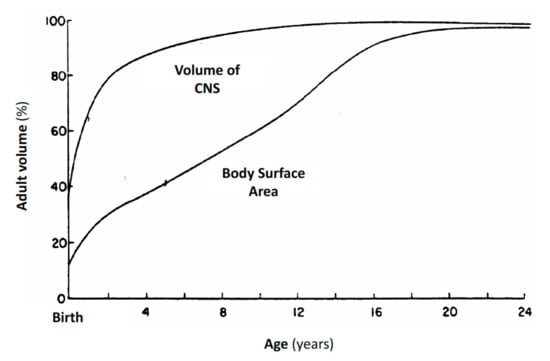 As shown in Figure 2, CSF volume is age-related in infants and young children, because it increases more rapidly than body surface area (BSA), reaching adult levels after the first three years of age. Thus, IT chemotherapy in children is usually administered with age-related dosage and not based upon BSA, to obtain an increased therapeutical effect, reducing neurotoxicity [83]. In Table 3 age-related dosage of triple intrathecal (TIT) chemotherapy used in pediatric oncology are reported [84].