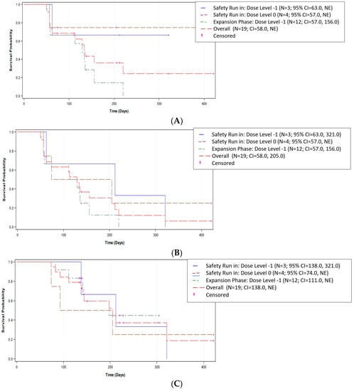 For analysis of the primary endpoint of TTP, 12 of the 19 EE patients (63.2%) had PD during the study. Data were censored for seven patients (36.8%). When censored data were included, Kaplan–Meier estimates showed an overall median TTP of 134.0 days (95% CI (confidence interval): 58.0, NE), with a range of 50 to 421 days (Figure 1A). The CIs were determined by the Brookmeyer and Crowley method (non-parametric), and the p-value comparison was performed using an approximate normal distribution for the Z-statistics test. The median observed TTP of 134.0 days was significantly greater than the historic control of approximately 63 days (p < 0.001) [28,29,30]. Sensitivity analysis in the safety population supported these findings with a median TTP of 156.0 days (95% CI: 63.0, NE), with a range of 16 to 421 days.