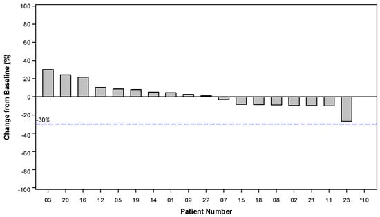 Percentage change in target lesion measurements from baseline. Best Response of the Sum of the Longest Target Lesion Diameters. Patient 10 exhibited new metastatic disease and was removed from the study without measurement of target lesions.