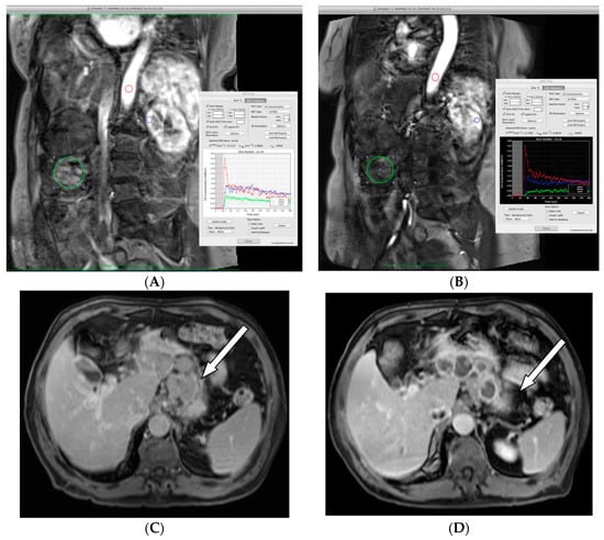 Effect of mipsagargin on blood flow metrics in hepatocellular carcinoma (HCC; A and B) and in a metastatic lymph node in HCC (C and D). (A,B) Radiograph of a patient with multifocal disease that included a previously treated large lesion in the inferior right hepatic lobe. Directly inferior and lateral to the large treated lesion, a 5 cm rounded lesion with arterial phase hyper-enhancement and prompt washout on the baseline contrast-enhanced magnetic resonance imaging (DCE-MRI) exam was selected for analysis. (A) DCE-MRI at baseline measured Ktrans = 0.72 − 0.76 min−1. (B) DCE-MRI following C2 and measured Ktrans = 0.14 − 0.16 min−1. (Red = aorta; blue = kidney; green = tumor. Range reflects use of larger and smaller regions of interest (ROIs) within the lesion. (C,D) Gastrohepatic metastatic lymph node involvement, indicated by the arrow, in a patient with advanced HCC. (C) DCE-MRI imaging assessment before treatment with mipsagargin. (D) Increased hypoenhancement after treatment with mipsagargin suggests response to treatment.