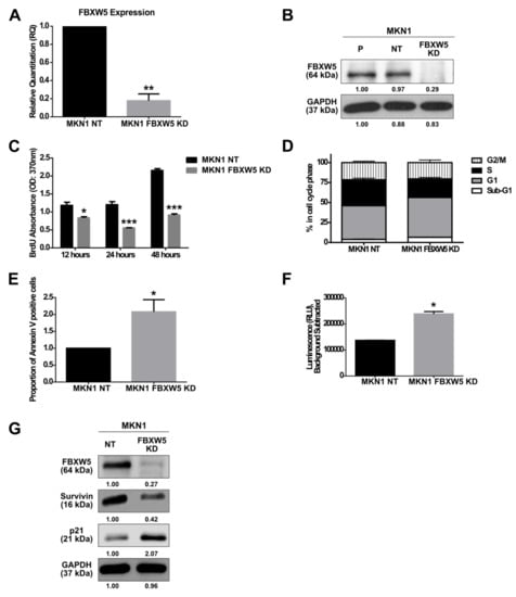 (A) Quantitative real-time PCR analysis of F-box/WD repeat-containing protein 5 (FBXW5) mRNA expression in MKN1 NT (non-targeting) and MKN1 FBXW5 KD (knockdown) cells (** p-value = 0.002). Values represent the average of three independent experiments and error bars denote standard deviations. At least three independent experiments were performed. (B) Western blot analysis of FBXW5 protein expression in MKN1 cells (P: Parental; NT: Non-targeting; FBXW5 KD: FBXW5 knockdown variant of MKN1). GAPDH served as the loading control. At least three independent experiments were performed. (C) Proliferation rates of MKN1 NT and MKN1 FBXW5 KD cells analyzed by (BrdU) proliferation assay across three time points (p-values = 0.01, 0.0008, 1.74 × 10−6, respectively). Values represent the average of three independent experiments and error bars denote standard deviations. (D) Cell cycle analysis of MKN1 NT and MKN1 FBXW5 KD cells in each cell cycle phase (p-values = 0.02, 0.04, 0.01, and N.S., respectively). Values represent the average of three independent experiments and error bars denote standard deviations. At least three independent experiments were performed. (E) The induction of apoptosis in serum starved MKN1 NT and MKN1 FBXW5 KD cells was evaluated by flow cytometry via an Annexin V-FITC apoptosis assay. The percentage of Annexin V positive cells was calculated. Data are presented as the mean values of the fluorescent intensities from two independent experiments and error bars denote standard deviations (* p-value = 0.03). (F) Caspase-3 activity of serum starved MKN1 NT and MKN1 FBXW5 KD cells (* p-value = 0.03). Values represent the average luminescence intensities of two independent experiments and error bars denote standard deviations. (G) Western blot analyses of survivin and p21 protein expressions in MKN1 NT and MKN1 FBXW5 KD cells. GAPDH served as the loading control. At least three independent experiments were performed. * p-value ≤ 0.05, ** p-value ≤ 0.01, *** p-value ≤ 0.001.