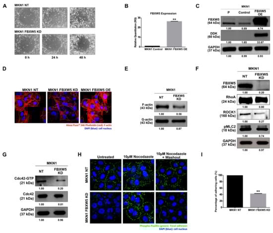 (A) Phase-contrast microscopic images (10×) of MKN1 NT and MKN1 FBXW5 KD cells, captured across three time points post removal of Radius Gel in the center of the well. At least two independent experiments were performed. (B) Quantitative real-time PCR analysis of FBXW5 mRNA expression in MKN1 control and MKN1 FBXW5 OE (overexpression) cells (** p-value = 0.009). Values represent the average of three independent experiments and error bars denote standard deviations. At least three independent experiments were performed. (C) Western blot analyses of FBXW5 and DDK protein expression in MKN1 cells (P: Parental; FBXW5 OE: FBXW5 overexpression variant of MKN1). GAPDH served as the loading control. At least three independent experiments were performed. (D) Immunofluorescent detection of F-actin (60×, oil immersion) in MKN1 NT, MKN1 FBXW5 KD, and MKN1 FBXW5 OE cells. Red: Phalloidin 546 labelled F-actin; blue: DAPI stained cell nucleus. At least two independent experiments were performed. (E) Western blot analyses of F-actin and G-actin protein expressions in MKN1 NT and MKN1 FBXW5 KD cells. At least two independent experiments were performed. (F) Western blot analyses of FBXW5, RhoA, ROCK1, and pMLC2 protein expressions in MKN1 NT and MKN1 FBXW5 KD cells. GAPDH served as the loading control. At least two independent experiments were performed. (G) Western blot analyses of Cdc42–GTP and Cdc42 protein expressions in MKN1 NT and MKN1 FBXW5 KD cells. GAPDH served as the loading control. At least two independent experiments were performed. (H) Immunofluorescent detection of focal adhesions (60×, oil immersion) in MKN1 NT and MKN1 FBXW5 KD cells, under three different conditions. Green: Alexa Fluor 488 labelled phospho-paxillin; blue: DAPI stained cell nucleus. At least two independent experiments were performed. (I) Percentage of adherent MKN1 NT and MKN1 FBXW5 KD cells quantified by microscopic examination (** p-value = 0.006). A total of four different fields were counted, and the average cell number was determined. Values represent the average of two independent experiments and error bars denote standard deviations.