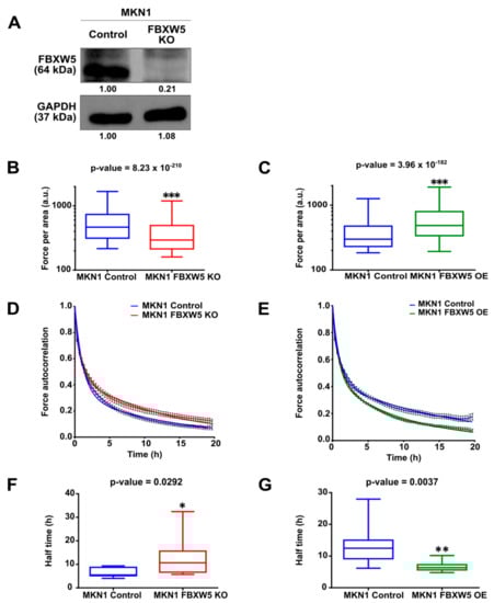 We next studied the role of FBXW5 in the generation of cellular traction forces. FBXW5 expression was stably knocked out in MKN1 cells by CRISPR/Cas9 transfection (Figure 3A). Here, cellular traction forces generated was assessed using a semi-quantitative application, which involves the use of fluorescent-labeled micro beads covalently bound on silica hydrogels. Quantification of cellular traction forces showed that knockout of FBXW5 in MKN1 cells resulted in a sustained decrease in the force exerted per area (p-value = 8.23 × 10−210) (Figure 3B), while overexpression of FBXW5 in MKN1 cells resulted in a sustained increase in the force exerted per area (p-value = 3.96 × 10−182) (Figure 3C). Subsequently, to examine the role of FBXW5 in turnover of adhesion force, the autocorrelation of the force magnitudes measured per area over some time was determined. Here, a steeper decrease in the resulting force autocorrelation functions was observed in MKN1 control cells as compared to MKN1 FBXW5 KO (knockout) cells (Figure 3D) and in MKN1 FBXW5 OE cells as compared to MKN1 control cells (Figure 3E). Lastly, based on quantification of autocorrelation function halftimes, we observed a significant increase in the halftimes with the knockout of FBXW5 (p-value = 0.0292) (Figure 3F), but a significant reduction in the halftimes with the overexpression of FBXW5 (p-value = 0.0037) (Figure 3G).