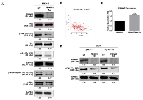(A) Western blot analyses of expressions of proteins involved in the focal adhesion kinase (FAK) signaling pathway in MKN1 NT and MKN1 FBXW5 KD cells. GAPDH served as the loading control. At least three independent experiments were performed. (B) Correlation between FBXW5 and F-box/WD repeat-containing protein 7 (FBXW7) expressions. Matched FBXW5 and FBXW7 expressions of 262 primary gastric adenocarcinoma tissues in the TCGA data portal (r = −0.32, p-value = 1.83 × 10−7). (C) Quantitative real-time PCR analysis of FBXW7 mRNA expression in MKN1 NT and MKN1 FBXW5 KD cells (** p-value = 0.003). Values represent the average of three independent experiments and error bars denote standard deviations. (D) Western blot analysis of p-FAK protein expression in MKN1 NT and MKN1 FBXW5 KD cells, without and with the addition of MG132. GAPDH served as the loading control. At least three independent experiments were performed.