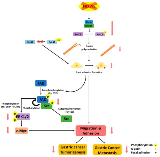 A study previously reported that induction of RhoA-ROCK1 signaling increases focal adhesion formation, which leads to the activation of FAK, which in turns regulates the organization of stress fibers, formation and turnover of focal adhesions [13,27,39]. Our findings fall in line with the previous observation, and further, suggest that down regulation of RhoA-ROCK1 and FAK activation in FBXW5 depleted cells could together contribute to the decrease in focal adhesions and migratory characteristics of gastric cancer cells. The aberrant activation of the FAK signaling pathway has been reported to confer the activation of ERK1/2 signal transduction to enhance cancer cell growth [40]. In the present study, FBXW5 knockdown cells with reduced p-FAK expression also displayed a down regulation in p-Src and p-ERK1/2 expression levels. The oncogenic potential of FAK activation is well substantiated by various studies that showed a role of FAK signaling in tumorigenesis, cell cycle progression at G1 phase [41], in cancer metastasis [11,42] and the inhibition of caspase-3 mediated apoptosis [43,44,45]. Collectively, our findings suggest that through the abovementioned cascade of events, FBXW5 has an oncogenic role in promoting gastric cancer tumorigenesis and metastasis.