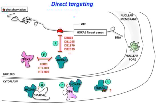 The PBX and MEIS proteins are not the only HOXA9-interacting proteins. For instance, SMAD4 (Mothers against decapentaplegic homolog 4), a TGF-β and bone morphogenic protein (BMP) signaling pathways associated factor, interacts with HOXA9 (Figure 3, point q) as demonstrated by co-immunoprecipitation. SMAD4 interferes with HOXA9 binding to the osteopontin (OPN) gene promoter through which HOXA9 represses OPN expression []. By contrast with the PBX/HOX protein/protein interaction that stabilized the binding to their DNA cognate sequence, the SMAD/HOX protein/protein interaction occurs through the MH1 domains of SMAD proteins in a manner that abolishes HOXA9 binding to DNA [,,]. Indeed, through interaction with SMAD4, HOXA9 (as well as the oncogenic fusion protein NUP98-HOXA9) was removed from DNA [] and sequestrated in the cytoplasm to protect normal hematopoietic stem cells and progenitor cell (HSPC) transformation by HOXA9 or NUP98-HOXA9, as evidenced in a mouse model of AML []. Consequently, increasing SMAD4 expression or stabilizing the SMAD4/HOXA9 complex by taking advantage of the structural properties of their interaction [] would be another interesting opportunity to target HOXA9 leukemogenic function.