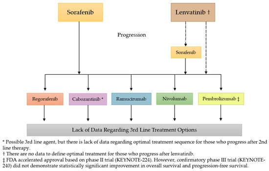 Despite recent advances in the development of oral TKIs as well as immune checkpoint inhibitors for the treatment of advanced HCC, physicians are faced with the challenge of sequencing such therapeutic agents (Figure 1). As of today, no additional agent has demonstrated superiority to sorafenib as first-line therapy for advanced HCC. However, the existing caveat for this molecularly targeted agent lies in the fact that a vast majority of patients enrolled into the SHARP and Asia-Pacific studies had well-preserved liver function (Child–Pugh A) and good performance status [15,17]. This is concerning as the majority of HCC patients are diagnosed at advanced stages, generally with chronic cirrhosis, poor liver function, and compromised functional status leaving this subgroup of patients at an increased risk of adverse events and toxicity.