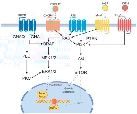 Signaling pathways and receptors involved in uveal melanoma (UM) and cutaneous melanoma (CM). Three main signaling pathways affected in UM and/or CM patients are depicted. G protein-coupled receptor (GPCR) with its Guanine nucleotide-binding proteins: the first is the Guanine nucleotide binding protein (GNAQ) and subunit alpha-11 (GNA11), which downstream activate Phospholipase C (PLC) and Protein Kinase C (PKC). The second is the mitogen-activated protein kinase (MAPK) signaling pathway, consisting of BRAF-MEK1/2-ERK1/2. Finally, there is the PI3K/Akt/mTOR pathway, which can be influenced by both RAS (from the MAPK signaling pathway) and phosphatase and tensin homolog (PTEN). The previously described chemokine receptors and their influence on the signaling pathways are added: C-X-C chemokine receptor 4 (CXCR4), with its C-X-C Motif Chemokine Ligand 12 (CXCL12), tyrosine-protein kinase Met (c-Met) and its ligand Hepatocyte Growth Factor (HGF), and Insulin-like Growth Factor-1 Receptor (IGF-1R), with Insulin-like Growth Factor-1 (IGF-1). In the nucleus, the ERK1/2 stimulates transcription factors, while both histone deacetylase (HDAC) and mechanistic target of rapamycin (mTOR) inhibit the formation of Reactive Oxygen Species (ROS). Figure was created with BioRender.com.