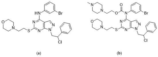 The anticancer activity of pyrazolo[3,4-d]pyrimidines has been proved in vitro against several cancer cell lines, both from solid tumors (osteosarcoma [38], prostate [39], neuroblastoma [40,41], glioblastoma [42,43], rhabdomyosarcoma [44], mesothelioma [45], medulloblastoma [46], medullary thyroid carcinoma [47]) and hematological tumors (leukemia [48] and Burkitt lymphomas [49]), and further confirmed by in vivo studies in mouse models of neuroblastoma [40], leukemia [48], and glioblastoma [50]. In particular, the combination of compound Si306 (Figure 1a), a pyrazolo[3,4-d]pyrimidine derivative with radiotherapy strongly potentiated the suppression of U87 xenograft growth in nude mice with respect to control and single treatments [50]. Moreover, following intraperitoneal (i.p.) injection, Si306 brain concentration progressively increased during the following 24 h, and the compound appeared to accumulate in the brain. Single oral treatment with Si306 prolonged by 30% the survival of mice orthotopically injected with U87 cells [50]. Overall, this evidence confirmed the ability of Si306 to efficiently reach the brain. Analogous results were obtained with the prodrug of Si306 (pro-Si306, Figure 1b), which showed an enhanced solubility and good efficacy in an orthotopic model of GBM with respect to the parental drug [50].