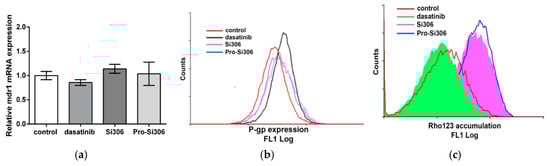 The expression of mRNA mdr1 was unaffected by all examined c-Src inhibitors (Figure 2a), while only dasatinib increased P-gp expression (Figure 2b). According to rhodamine (Rho) 123 (fluorescent P-gp substrate) intracellular accumulation after 30 min, Si306 and its prodrug considerably inhibited P-gp activity, while dasatinib did not show a similar activity (Figure 2c).