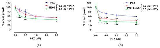Considering the potential of Si306 and pro-Si306 to inhibit P-gp function, we examined their ability to reverse paclitaxel (PTX) resistance in U87-TxR cells (Figure 4 and Table 3).