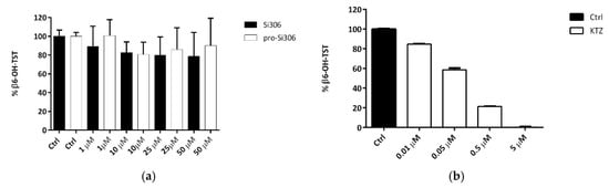 Inhibition of CYP3A4 isoform activity by Si306 and pro-Si306 (a) and ketoconazole (KTZ, b), measured as % β6-hydroxytestosterone (β6-OH-TST) mean ± S.D., compared to the control (Ctrl) mix in absence of compounds (n = 3).
