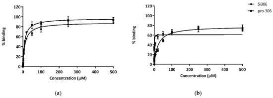 Binding % curves corresponding to the best fit ± S.D. of the data referring to the fluorescence quenching of AGP (a) and HSA (b) exposed to a 0–500 µM concentration range of Si306 and pro-Si306 which is reported on the x axis (n = 3).