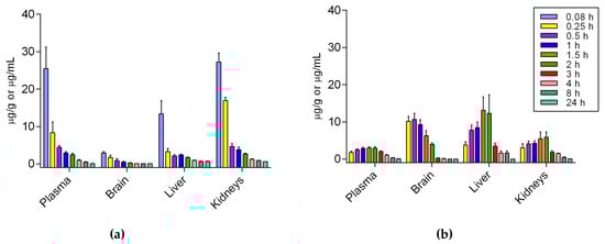 An immediate distribution followed by a fast concentration decrease in a time-dependent manner was also observed for liver and kidneys when Si306 was administered intravenously (Figure 7a). On the other hand, orally administered Si306 showed its Cmax in liver and kidneys at 1.5 h and 2 h respectively (Figure 7b).