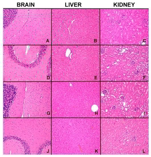 The figure shows representative microscopic pictures (200× magnification) of kidney, liver and central nervous system tissues of untreated mice (A–C); mice treated with only vehicle (D–F); mice treated with dose level of 50 mg/kg of Si306 (G–I) and mice treated with the dose level of 100 mg/kg of Si306 (J–L).