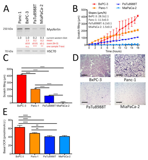 Myoferlin abundance is correlated with pancreatic cell migratory phenotypes and oxygen consumption rate. (A) Myoferlin relative abundance in Panc-1, BxPC-3, PaTu8988T, and MiaPaCa-2 cell lines. Heat Shock Cognate 71 kDa protein (HSC70) was used as an internal loading control. Myoferlin abundance was compared by one sample T-test to Panc-1 sample mean arbitrary fixed to 1. (B) Two-dimension migration kinetic assay (scratch assay) of BxPC-3, Panc-1, PaTu8988T, and MiaPaCa-2 cell lines. (C) End point (16 h) of two-dimension migration kinetic assay (scratch assay) of BxPC-3, Panc-1, PaTu8988T, and MiaPaCa-2 cell lines. (D) Three-dimension migration assay in Boyden’s chamber of BxPC-3, Panc-1, PaTu8988T, and MiaPaCa-2 cell lines (scale bar = 500 µm). (E) Basal oxygen consumption rate (OCR) in BxPC-3, Panc-1, PaTu8988T, and MiaPaCa-2 cell lines. One representative experiment out of three is illustrated. Each data point represents mean ± SD (± SEM for panel A), n = 3. **** P < 0.0001, *** P < 0.001, ** P < 0.01.