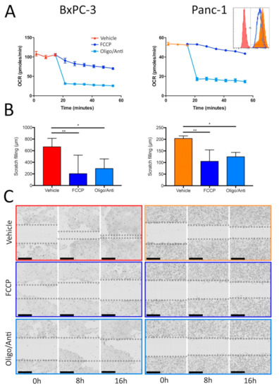 Migration is dependent on oxidative phosphorylation (OXPHOS) in high myoferlin expressing pancreatic ductal adenocarcinoma (PDAC) cell lines. (A) Kinetic oxygen consumption rate (OCR) in BxPC-3 and Panc-1 cells before and after treatment with 10 µM FCCP or 10 µM oligomycin (Oligo) + 1 µM antimycin A (Anti). Panc-1 inset represents mitochondrial membrane potential measurement by tetramethylrhodamine, ethyl ester (TMRE) fluorescence in the same conditions. (B) End point (16 h) of two-dimension migration kinetic assay (scratch assay) of BxPC-3 and Panc-1 cell lines after treatment with 10 µM FCCP or 10 µM oligomycin (Oligo) + 1 µM antimycin A (Anti). (C) Representative images of two-dimension migration kinetic assay with BxPC-3 and Panc-1 after treatment with FCCP 10 µM or 10 µM oligomycin (Oligo) + 1 µM antimycin A (Anti). One representative experiment out of three is illustrated. Each data point represents mean ± SD, n = 3. ** P < 0.01, * P < 0.05.