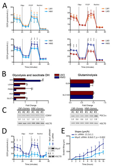 As myoferlin has been shown to be a key element to sustain a high metabolic flexibility [26] and an optimal mitochondrial fitness [25], we decided to compare the oxygen consumption rate (OCR) of HM and LM clones (Figure 5A). No significant differences were observed between LM and HM clones from the first selection round. Similarly, LM clones from the first selection round were not significantly different from the LM clones obtained after three rounds of in vivo selection. Interestingly, HM clones selected by three rounds of injection (HM3) showed a significantly higher OCR than HM clones selected by only one round (HM1) of injection, indicating a progressive amplification of OXPHOS according to the increase of the metastatic potential, resulting in an enhanced OCR in HM clones compared to that in LM clones in the last round of selection. A similar observation was made in HT29 LM and HM clones (Figure S3A). To depict a more complete view of the clone metabolism, we estimated the gene expression of different metabolism-related proteins; we showed that the LM3 clone was globally more glycolytic with a significantly increased expression of glucose transporter (GLUT1), pyruvate kinase muscle 2 (PKM2), and lactate dehydrogenase (LDHA) whereas the HM3 clone was more oxidative with a higher expression of isocitrate dehydrogenase (IDH) (Figure 5B). Taken together, our results allow us to suggest that high OXPHOS is selected in HM clones to support their high metastatic potential. Surprisingly, difference was observed neither in the gene expression of glutamine-related enzyme (Figure 5B) nor in the cytochrome c oxidase abundance (Figure 5C, quantification in Figure S3B). At the opposite, the abundance of the main positive regulator of OXPHOS PGC1-α followed the migratory potential of the LM and HM clones (Figure 5C, quantification in Figure S3C). We next wanted to functionally link the increased OXPHOS activity of the HM clones with their high myoferlin expression. We thus silenced myoferlin in the HM3 clone and monitored the OCR. We observed a significant decrease of basal and maximal OCR following myoferlin silencing in the HM3 clone (Figure 5D) while no significant modification was observed in the LM3 clone (Figure S3D). The same observation was made in HT29 LM and HM clones (Figure S3E). We then wanted to provide a direct evidence of the requirement of myoferlin for migration. We thus silenced myoferlin in the HM3 clone and assessed its 2D migration ability. The HM3 clone transfected with irrelevant siRNA migrated slightly faster that the parental Panc-1 cells (respectively 13.2 ± 1.1 vs. 11.5 ± 0.3 µm/h) while the HM3 clone transfected with myoferlin siRNA#1 showed a significantly slower migration speed than the irrelevant siRNA-transfected HM3 clone (respectively 8.8 ± 0.7 vs. 13.2 ± 1.1 µm/h, P = 0.002) (Figure 5E), making them similar to PaTU8988T cell line (6.2 ± 0.1 µm/h).