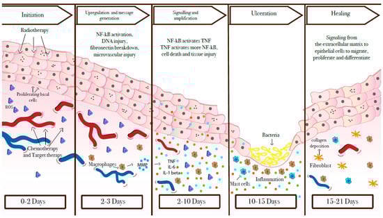 Five stages of pathogenesis have been identified for mucositis: initiation, upregulation/activation, signal amplification, ulceration, and healing (Figure 1) [7,13].