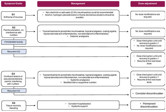 In patient receiving CDK4/6 inhibitors the incidence of all-grade OM was low, 1% ≥ G3 OM [119]. No high-grade stomatitis required dose reductions or treatment discontinuation.