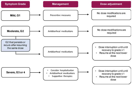 Management: Clinical experience with these drugs is still limited and data on their proper management are not yet available. Blood tests may identify alterations in electrolyte levels. [122]. Nausea and vomiting could be treated with the usual antiemetics (i.e., metoclopramide, serotonin 5-HT3 antagonists) if necessary [122]. However, clinicians should be aware of potential interactions between ribociclib and co-medications, due to the risk of QTc prolongation. Upfront management of diarrhea includes hydration and dietary modification. If needed, the treatment could be extended to antidiarrheal agents (loperamide, diphenoxylate/atropine, octreotide, etc.) (Figure 3).