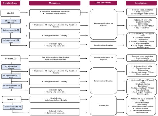 Clinical presentation: OM appears shortly after the first cycle with gradual recovery 2–3 weeks after the discontinuation of treatment [8]. The clinical course may be protracted when complicated by infection, in particular if associated with severe neutropenia [6]. Nausea, vomiting, dysphagia and dyspepsia, with or without pain, can be caused either by infections such as candidosis or, less commonly, as a direct effect of treatment [76]. GIM is usually acute, with rapid onset of diarrhea (generally within 24–48 h of treatment), abdominal pain, nausea, vomiting, anorexia and, in severe cases, weight loss, dehydration and sepsis [24,77].