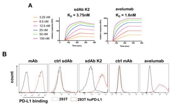 Characterization of sdAb K2, a sdAb that specifically binds to human PD-L1. (A) Representative sensograms showing the affinity/kinetics of different concentrations of purified sdAb K2 or avelumab, interacting with immobilized recombinant human PD-L1 protein, as determined in surface plasmon resonance (SPR). (B) Representative flow cytometry histograms showing labeling of PD-L1NEG (grey) versus PD-L1POS (red) 293T cells with mAbs specific for PD-L1, ctrl sdAb (sdAb R3B23), sdAb K2, control mAb (isotype-matched) or avelumab.
