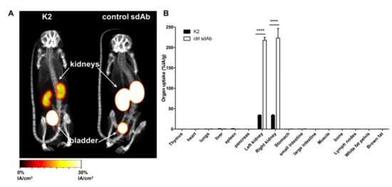 Radiolabeled sdAb K2 shows little signal in healthy mice. (A) SPECT/CT images showing the biodistribution of 99mTc-K2 or 99mTc-R3B23 (control sdAb) 1 h after i.v. administration in healthy C57BL/6 mice (n = 3). (B) Ex vivo analysis of the biodistribution of 99mTc-K2 or 99mTc-R3B23 (control sdAb) in dissected tissues and organs 80 minutes after i.v. administration in healthy C57BL/6 mice (expressed as percent injected activity per gram, %IA/g; n = 3). **** p < 0.0001.