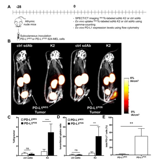 - Broos, K.; Keyaerts, M.; Lecocq, Q.; Renmans, D.; Nguyen, T.; Escors, D.; Liston, A.; Raes, G.; Breckpot, K.; Devoogdt, N. Non-invasive assessment of murine PD-L1 levels in syngeneic tumor models by nuclear imaging with nanobody tracers. Oncotarget 2017, 8, 41932–41946. [Google Scholar] [CrossRef] [PubMed]