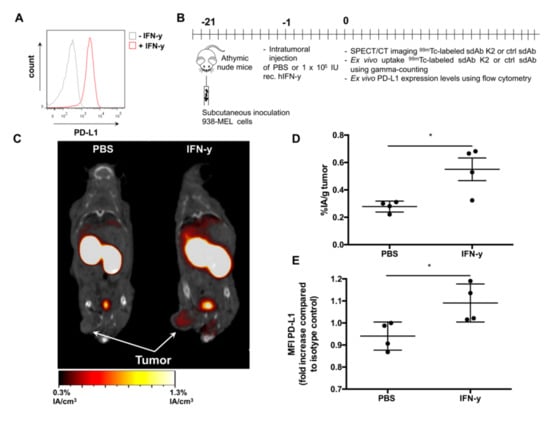 Following validation in two PD-L1 engineered tumor cell mouse models, we evaluated whether sdAb K2 can be used to detect PD-L1 expression in response to IFN-γ. The 938-MEL model was used as we observed in flow cytometry that in vitro treatment of 938-MEL cells with 100 IU/mL IFN-γ leads to upregulation of PD-L1 (Figure 5A). We next injected recombinant IFN-γ in 938-MEL tumors grown in athymic nude mice and used 99mTc-K2 and SPECT/CT imaging to evaluate PD-L1 expression (Figure 5B). Tumors of on average 150 mm3 were injected with PBS (control) or 104 IUs IFN-γ. One day later, we performed SPECT/CT imaging, showing detection of PD-L1 in IFN-γ but not of PBS treated tumors (Figure 5C). Furthermore, ex vivo γ-counting showed higher uptake of 99mTc-K2 in mice treated with IFN-γ (0.55 ± 0.08%IA/g) compared to mice treated with PBS (0.28 ± 0.02%IA/g) (Figure 5D). Evaluation of PD-L1 expression on tumor cells using flow cytometry confirmed higher PD-L1 expression on IFN-γ treated tumors compared to PBS treated tumors, although PD-L1 expression levels were low (Figure 5E).