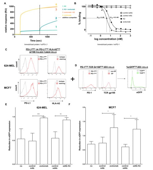 We used this platform to evaluate the blocking ability of sdAb K2, as schematized in Figure 6C,D. In particular, HLA-A2POS PD-L1POS or PD-L1NEG 624-MEL melanoma or MCF7 breast cancer cells (Figure 6C) were pulsed with the gp100280–288 peptide. These cells were co-cultured with PD-1POS 2D3 cells expressing the TCRαβ recognizing gp100280–288 in the context of HLA-A2 (Figure 6D). When the gp100280–288 peptide is recognized by the specific TCR on the 2D3 cells, this will lead to eGFP upregulation by the 2D3 cells (Figure 6D). Co-culturing of PD-1POS 2D3 cells with PD-L1POS tumor cells reduced eGFP expression, a measurement for TCR triggering, compared to co-culturing PD-1POS 2D3 cells with PD-L1NEG tumor cells (Figure 6E,F, condition ‘no’; 0.53 ± 0.21 for the 624-MEL model and 0.71 ± 0.09 in the MCF7 model). This reflects the effect of the interaction between PD-1 and PD-L1, leading to inhibition of TCR signaling [26]. Adding 360 nM of sdAb K2 or avelumab could increase eGFP expression levels, or in other words alleviate the inhibition on TCR signaling by the PD-1:PD-L1 interaction (0.93 ± 0.05 for sdAb K2 and 0.98 ± 0.02 for avelumab). Moreover, eGFP expression of PD-1POS 2D3 cells co-cultured with PD-L1POS MCF7 tumor cells treated with sdAb K2 or avelumab was even higher compared to co-culturing with PD-L1NEG MCF7 tumor cells (1.23 ± 0.33 for sdAb K2 and 1.28 ± 0.46 for avelumab) (Figure 6E,F).