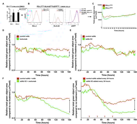 We also explored whether adding sdAb K2 to co-cultures of activated PBMCs and tumor cells would result in enhanced tumor cell killing. Because CD8POS T cells are critical to mediate tumor cell killing, we first evaluated the expression of PD-1 and PD-L1 on CD8POS T cells, present within the pool of PBMCs, stimulated with a cocktail of anti-CD3 antibodies and IL-2. We showed, using flow cytometry, that both PD-1 and PD-L1 were upregulated on CD8POS T cells, thereby confirming activation of these cells (Figure 7A). The PBMCs, containing activated CD8POS T cells, were added to PD-L1POS or PD-L1NEG 624-MEL tumor cells that were lentivirally engineered to express eGFP and that were grown in 3D spheroids (Figure 7B). The eGFP signal can be monitored in real-time using the IncuCyte Zoom® live cell imaging system and is used to measure tumor cell growth. In the absence of PD-1:PD-L1 blocking moieties, we observed that the green objective area of the eGFPPOS PD-L1POS tumor cells increased in time, signifying that tumor cells were not killed by activated T cells, and as such, confirming the inhibitory role of PD-L1 on tumor cell killing by PD-1POS CD8POS T cells (Figure 7C). Addition of 3.6 μM avelumab or sdAb K2 to PD-L1POS tumor cells and stimulated PBMCs reduced the green objective area, signifying that tumor cell killing occurred (green curve) when compared to the addition of a control mAbs or sdAb R3B23 (red curve) (Figure 7D,E). The effect of adding avelumab on tumor cell killing could be observed at 80 hours, which is reflected by the reduction in green objective area at that time point (Figure 7D), while the effect of sdAb K2 was observed in the first hours of culture (Figure 7E). Hence, sdAb K2 showed early and short therapeutic activity, while avelumab showed a more durable blocking activity. We next evaluated whether adding both sdAb K2 and avelumab to PD-L1POS tumor cells and PD-1POS stimulated PBMCs could enhance the tumor cell killing. We showed more efficient tumor cell killing (after 70 h) compared to the addition of avelumab or sdAb K2 separately (Figure 7F). Remedying the short action of sdAb K2, we also tested the effect of repeated administrations of sdAb K2 with 24 h intervals to PD-L1POS tumor cells and PD-1POS stimulated PBMCs. This resulted in efficient tumor cell killing by activated PBMCs after 50 hours (Figure 7G), supporting the therapeutic potential of sdAb K2.
