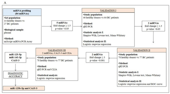 This staging group heterogeneity might lead to different results in different cohorts. Another limitation was the inability of monitoring patients during follow-up to better understand the prognostic and predictive role of miR-125b-5p and miR-143-3p. Nevertheless, the strengths of this study included the analysis performed on naïve patients as well as the availability of the same-day imaging parameters that provided information related to the morpho-functional characteristics of the primary cancers to correlate circulating miRNAs with in vivo quantified tumour biology. We performed a combined detection of miR-125b-5p and miR-143-3p with CA15-3 to improve the diagnostic accuracy. As suggested by guidelines, CA15-3 is not recommended for BC diagnosis [42,43], and our result (CA15-3AUC = 0.70) was in agreement with those of Liu and colleagues (CA15-3AUC = 0.71 [44]), Zaleski and colleagues (CA15-3AUC = 0.72 [45]) and Zajkowska and colleagues (CA15-3AUC = 0.70 [46]). Nevertheless, the coupled analysis of miR-125b-5p and CA15-3 increased the diagnostic accuracy up to AUC = 0.89. To the best of our knowledge, this is one of the best results published so far and the first study that combines the expression of a circulating miRNA with the expression of an established BC tumour marker. The combined detection of plasma miR-125b-5p and serum CA15-3 improved the diagnostic accuracy of BC detection up to ~90%, suggesting that this signature could be used for the diagnosis of BC. In addition, for stage II, the expression levels of CA15-3 were not correlated with the pathology (p-value = 0.658), whereas those of miR-125b-5p were (p-value = 0.002). The combined analysis of miR-125b-5p and CA 15-3 not only improved diagnostic accuracy in its entirety but also provided additional diagnostic information at less advanced pathological stages, suggesting the use of miRNAs as potential diagnostic circulating biomarkers that warrants consideration by further validation studies.