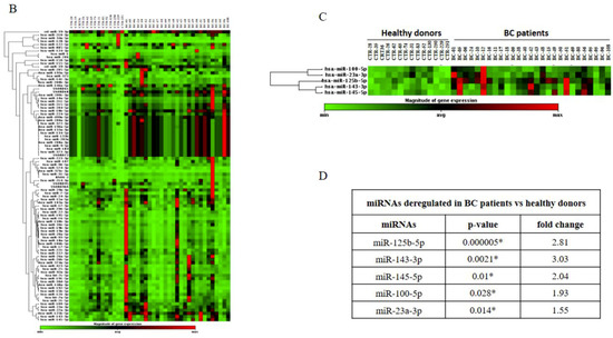 Study design for the identification of circulating miRNAs and protein biomarkers able to discriminate breast cancer (BC) patients from healthy donors (A). miRNA expression analysis in a set population of 14 healthy donors (CTR) and 27 BC subjects. Expression analysis of 84 miRNAs by using a 96-well miScript miRNA PCR Array (B). * miRNAs significantly upregulated (p < 0.05) in BC patients vs. healthy donors (C,D).