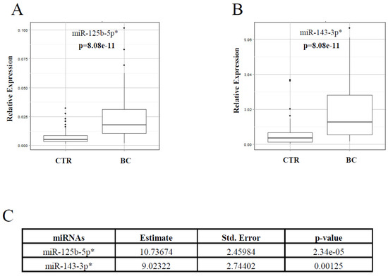 Validation II. Relative expression of miRNAs selected in a study population of 78 healthy donors (CTR) and 77 breast cancer (BC) subjects. Box plot analyses performed to show the relative expression of miR-125b-5p (A) and miR-143-3p (B) in the plasma samples of healthy donors vs. BC patients. Logistic stepwise regression analysis (C). * miRNAs that significantly (p < 0.05) estimate the probability of having BC.