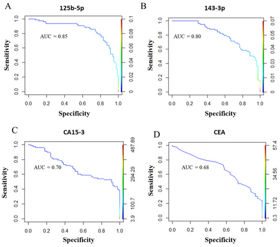 Receiver operating characteristic (ROC) curve analyses showed that miR-125b-5p (area under the ROC curve (AUC) = 0.85) and miR-143-3p (AUC = 0.80) were able to discriminate BC patients from healthy donors (Figure 3A,B). Then, we compared the AUC value of the selected miRNAs with the AUC value of the traditional BC biomarkers CA15-3 and CEA. As reported in Figure 3C,D, the AUC values of CA15-3 (0.70) and CEA (0.68) were lower than those calculated for miR-125b-5p and miR-143-3p. Based on these results, a logistic stepwise regression analysis was performed considering the miR-125b-5p, miR-143-3p, CA15-3 and CEA molecules as independent variables (Figure 1A, Validation III). According to Table 2, miR-125b-5p, miR-143-3p and CA15-3 were significantly correlated with the disease, although the statistical significance of CA15-3 was lower than that of the miRNAs. Based on these findings, the diagnostic accuracy of each biomarker was evaluated. To this end, the cut-off values of miR-125b-5p and miR-143-3p were calculated, and the clinical cut-off values of CA15-3 and CEA were already known (CA15-3 = 35 UI/mL and CEA = 3 UI/mL). Using the “closest to top-left” method, we defined the cut-off value of miR-125b-5p as 0.0090 and that of miR-143-3p as 0.0064, both related to relative expression. Among the analysed molecules, miR-125b-5p showed the highest diagnostic accuracy (Table 3).