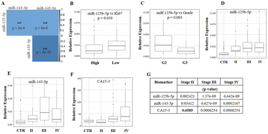 Correlation studies. Co-expression analyses of miR-125b-5p, miR-143-3p and miR-145-5p (A). Expression levels of miR-125b-5p vs. Ki67 (low <20%; high ≥20%) (B), and grade (C). Expression levels of miR-125b-5p (D), miR-143-3p (E), and CA15-3 (F) vs. stage. Statistical significance (G). Non-significant results are reported in bold.