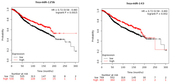 Kaplan-Meier plots, which are based on breast cancer data from the METABRIC database, illustrate the survival probability for patients with low or high miR-125b (upper panel) and miR-143 (lower panel) expression levels in breast cancer. Hazard ratios (HRs) and p-values (log-rank test) were generated.