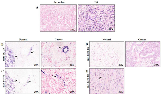 In situ hybridization staining patterns in benign and malignant breast tissues. Scrambled miR negative control probe and U6 positive control probe (A). miR-143-3p in normal (left) and BC tissues (right) (B). miR-145-5p in normal (left) and BC tissues (right) (C). miR-125b-5p in normal (left) and BC tissues (right) (D). miR-125b-5p in stromal tumour tissue (E). BC: breast cancer.