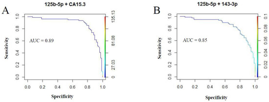 ROC curve analyses and AUC values combining the profiles of miR-125b-5p and CA15-3 (A) and miR-125-5p and miR-143-3p (B) for discriminating BC patients from healthy patients. ROC: Receiver operating characteristic; AUC: area under the ROC curve; BC: breast cancer.