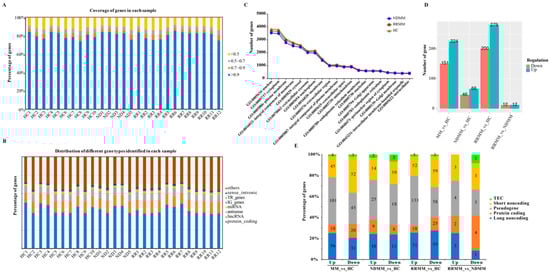 Overview of the transcriptome of extracellular RNA (exRNA) in healthy controls (HC) and multiple myeloma (MM) patients. (A) Distribution of gene coverage in each sample. (B) Distribution of gene types in each sample. (C) Top 20 terms of the GO cellular component identified by the genes in HC, newly diagnosed multiple myeloma (NDMM), and relapsed and refractory multiple myeloma (RRMM). (D) Status of differentially expressed genes identified in MM compared to HC. (E) Distribution of gene types for the differentially expressed genes (DEGs).