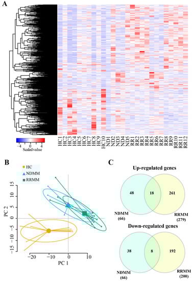 Comparison of DEGs in NDMM and RRMM. (A) A heat map of the DEGs showed different signatures for HC, NDMM, and RRMM. (B) Principle component analysis of all samples. (C) Venn diagrams of up- and down-regulated genes identified in all MM patients, NDMM, and RRMM.