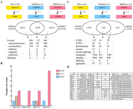 SNP and indel analysis. (A) Identification of SNPs in MM and their annotation. (B) Comparison of the distribution and the frequency of mucin gene mutations in NDMM and RRMM. (C) Identification of small indels in NDMM and RRMM. (D) Annotation of 13 known small indels specific to NDMM.