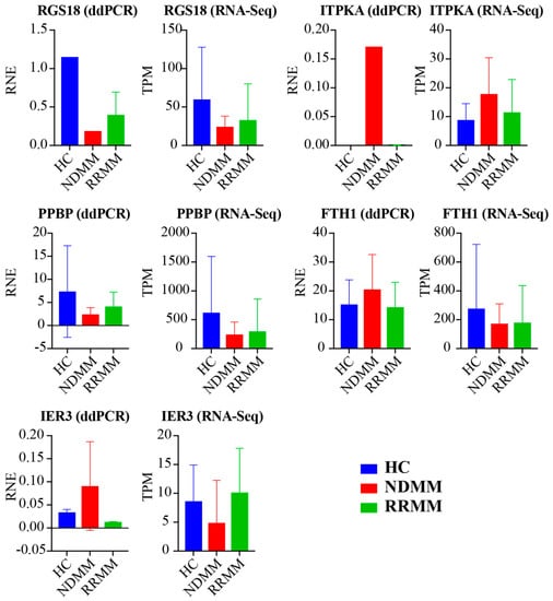 We randomly selected 10 samples used for RNA-Seq, including three HC, two NDMM, and five RRMM patients for gene expression validation using droplet digital PCR (ddPCR). Initially, 3 mL of plasma samples were used for exRNA extraction, as described. Then, a NanoDrop 1000 was used to quantify the RNA yield. One-Step RT-ddPCR Advanced Kit for Probes (Bio-Rad Laboratories, Hercules, CA, USA) was used for the detection of five DEGs, including RGS18 (dHsaCPE5054808), ITPKA (dHsaCPE5192800), PPBP (dHsaCPE5039499), FTH1 (dHsaCPE5031151), and IER3 (dHsaCPE5190327), according to the manufacturer’s instructions. Briefly, the reaction mix (22 µL) was prepared with 5 µL Supermix (1×), 2 µL reverse transcriptase (20 U/µL), 1 µL DTT (300 nM), 1 µL gene probe (900 nM), 1 µL total RNA, and 12 µL RNase-free water. Then, the droplets were generated on the Automated Droplet Generator (Bio-Rad), followed by the thermal cycling reaction. The cycling conditions were conducted on a C1000 Touch Thermal Cycler (Bio-Rad) as follows: reverse transcription (46 °C, 60 min), enzyme activation (95 °C, 10 min), 40 cycles of denaturation (95 °C, 30 s), and annealing/extension (60 °C, 1 min), and enzyme deactivation (98 °C, 10 min). After thermal cycling, the plates were read by the QX200 Droplet Reader (Bio-Rad) and the QuantaSoft software was used to analyze the data. To reduce the errors, we employed GAPDH (Glyceraldehyde-3-Phosphate Dehydrogenase) as an internal control and the gene expression was shown relative to the absolute copies of GAPDH. Aberrant values (>500 copies/µL) were set to null, and samples with no gene expression were not counted for the calculation of the average gene expression.
