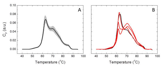 In the last decade, differential scanning calorimetry (DSC) analysis of blood plasma has arisen as a promising approach for the discrimination of healthy and cancer patients [13,14,15,16]. A DSC thermogram reflects the global denaturation profile for all major blood plasma proteins and their potential interactions with other blood plasma constituents (proteins and metabolites). The composition of blood serum can be significantly altered, either by the up- or down-regulation of proteins, or by the release of disease-related metabolites into the bloodstream. A plasma thermogram would reflect the distortion caused by the tumor. Therefore, this technique could be employed as a clinical test for diagnosing, classifying, and monitoring patients, since the thermograms from a diseased subject and a healthy subject can be considerably different [17,18]. Our group has previously shown that DSC can be applied for classifying and staging gastric adenocarcinoma patients and monitoring melanoma patients during their treatment [19].